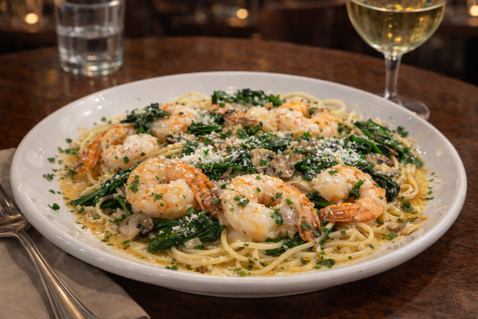 Jumbo Shrimp sautéed with fresh Garlic, Spinach, Mushrooms, White Wine and Lemon served with Linguine Pasta.