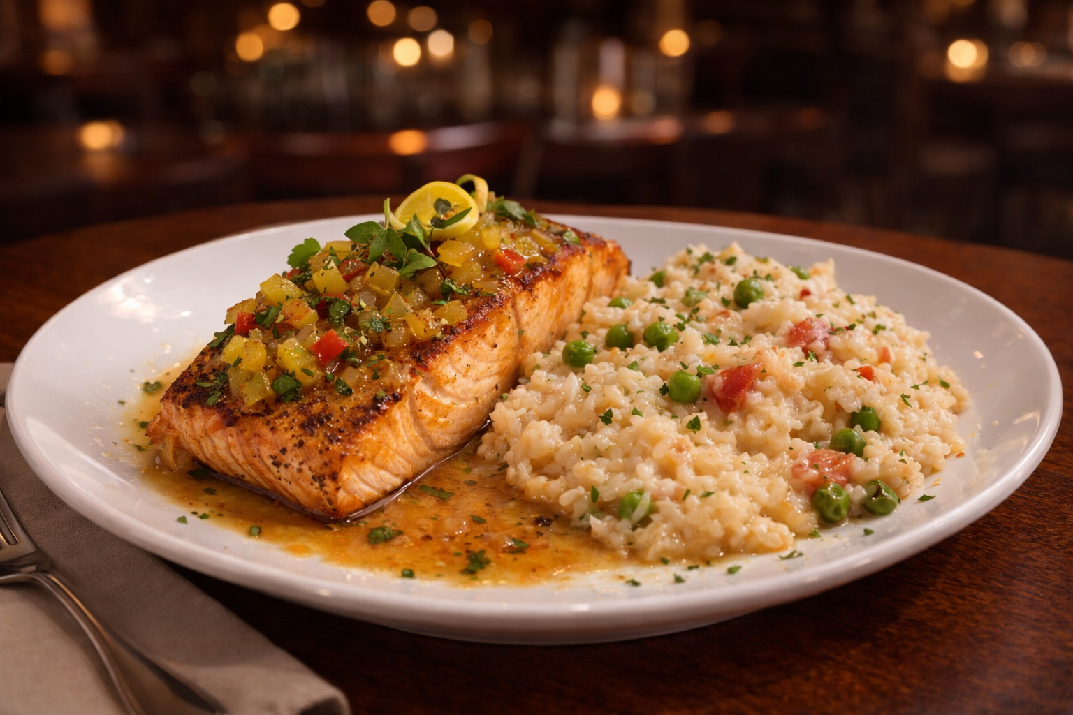 12 Ounces of Salmon Filet with the Chef's Sauce of the Day served with Parmesan Risotto.
