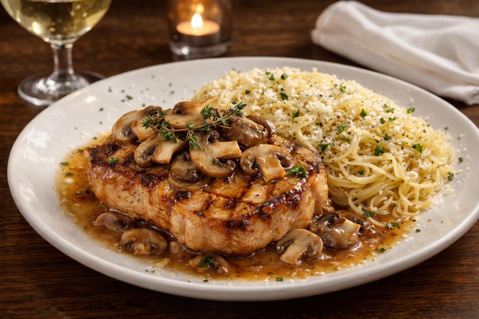 Two Boneless 8 oz. Center Cut Chops grilled and finished with the Chef's Sauce of the Day. Served with Angel Hair Pasta.