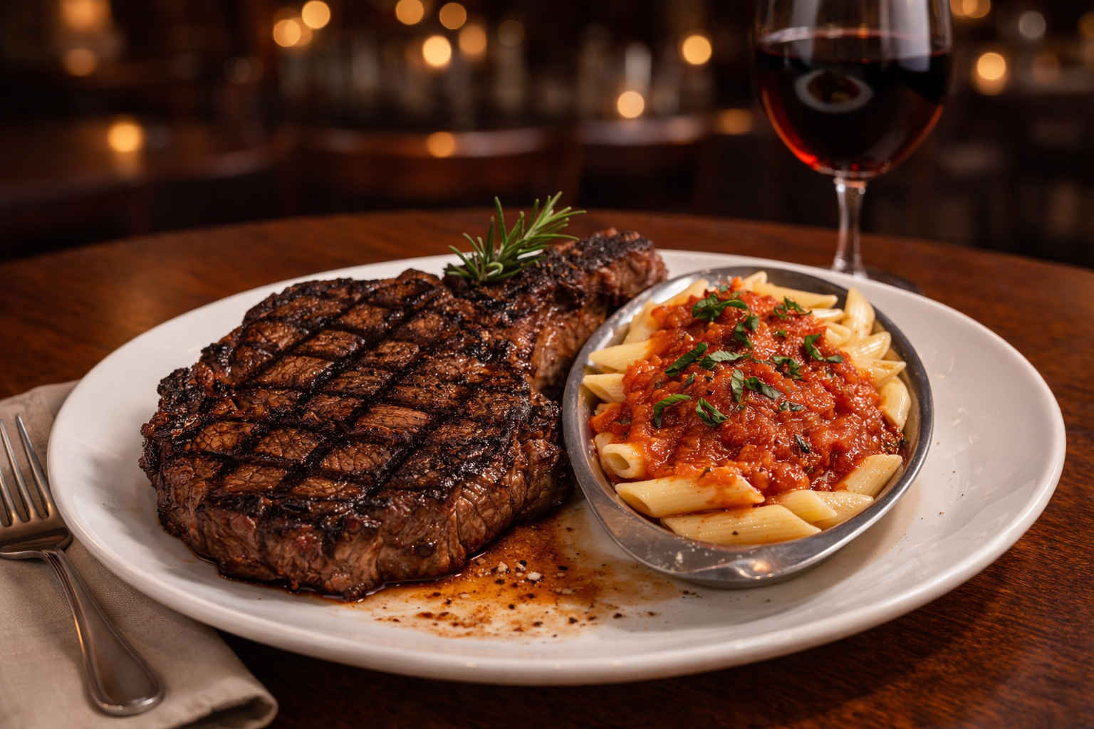 1 ½ Pound (HUGE 24 oz) Certified Angus Beef, Center Cut Rib-eye Steak from Midwestern Heavy Aged Beef, seasoned and perfectly seared. Served with Penne Marinara.