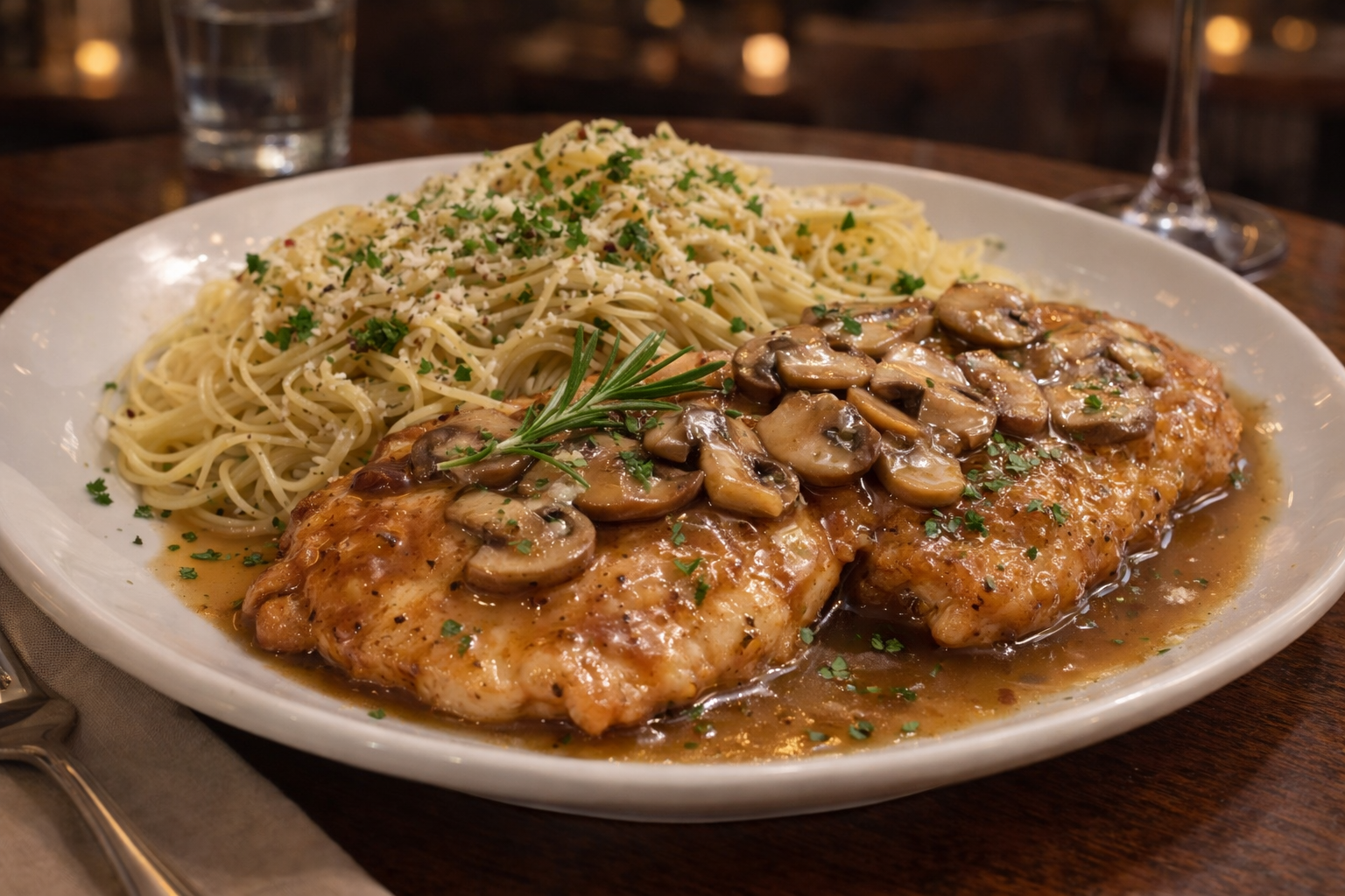 Chicken Breasts sautéed with Mushrooms, Butter and Marsala Wine with Angel Hair Pasta.
